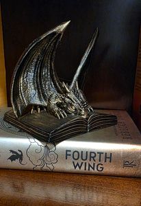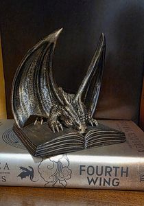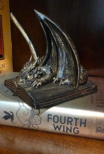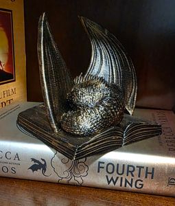 Cute baby dragon asleep on a book. 3D print with antique gold finish. Bookshelf or table decor. Felt on the bottom to prevent scratching surfaces. Approx 5x5x6 inches