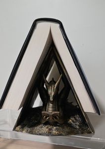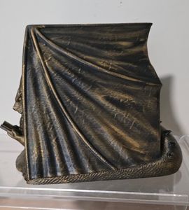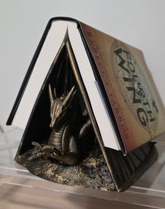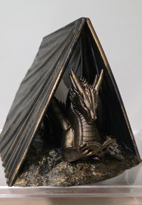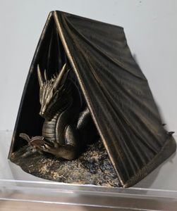 Book holder featuring a reading dragon. 3D printed with a faux antique gold finish. Felt on the bottom to prevent scratching. Approx. 8x8x7 inches.