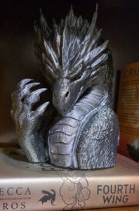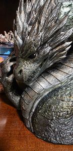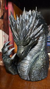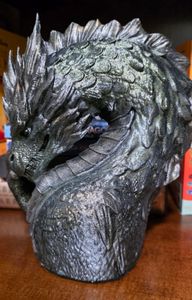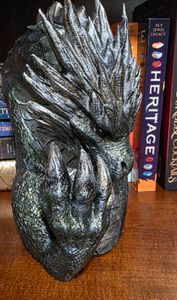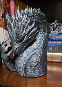 Dragon bust, table or bookshelf decor. 3D printed and hand painted with a metallic and shimmering scales finish. Approx. 8x7x6 inches