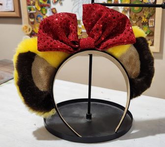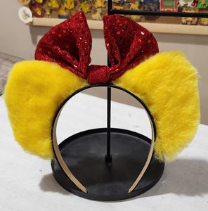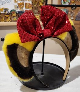Super soft yellow fur with a large red bow. Headband is one size fits most.