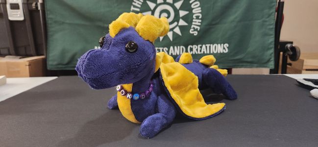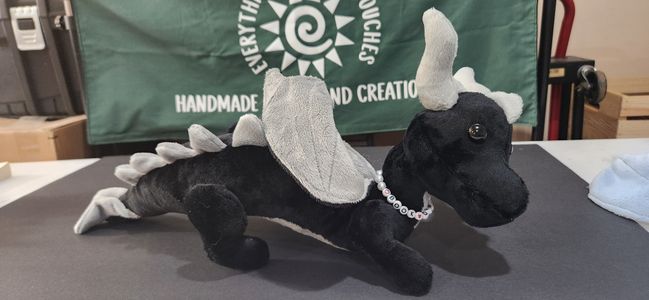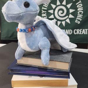 Adorable hand made dragon plush! Approx. 17 inches long nose to tail, these adorable companions come in various colors and each wears a 'Book Dragon' collar that can also be used as a bracelet for you. Made of soft minky fur.